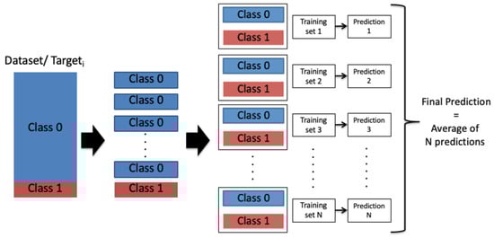 However, due to the imbalance of the output class labels, the performance of the individual CNN model toward the output class 1 was not high enough. Therefore, we proposed a model-averaging, method using a random under-sampling technique to balance the data evenly for every targeti. The training was conducted over a number of balanced subsets, where the entire dataset was divided randomly into N balanced subsets according to the minority class distribution as presented in Figure 6. N was chosen so that the division generated equally-distributed representation of the two output classes through all the targets (heart disease types), as presented in Equation (14):