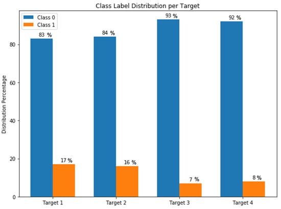 Every type is represented with a binary target variable indicating whether a patient is diagnosed with the given type of heart disease or not. Because the types are different, the distribution of each target over the records is proportionally different and significantly unbalanced as shown in Figure 7, where the class 0 (i.e., a patient is not diagnosed with a heart disease type) presents the majority class label comparing to the class 1 (i.e., a patient is diagnosed with a heart disease type).