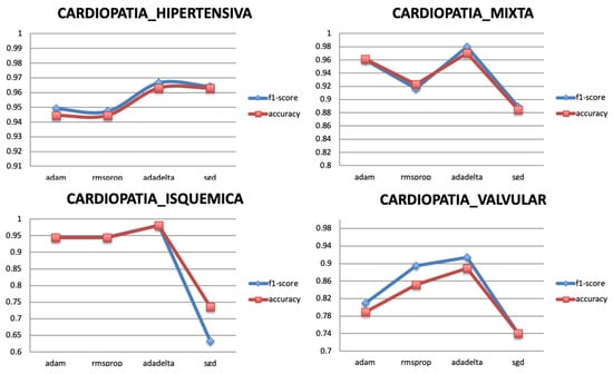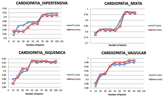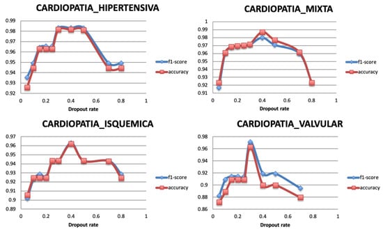 The proposed classification models present a list of hyperparameters that includes number of epochs, dropout rate, optimizer, learning rate, and so on. Considering their effect on the model performance, only four hyperparameters were selected for the tuning. The dataset was randomly split into a training set and a test set according to the division 20–80%. In each experiment, the neural network parameters were fixed and each hyperparameter was varied. The experiments were reported using the accuracy score and the F1 score.