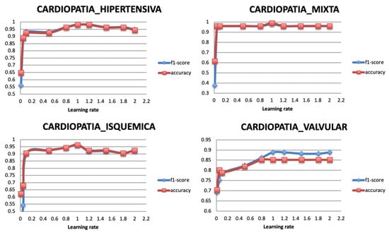 The optimization of the weights is monitored with a learning rate. Therefore, after selecting the optimal optimizer Adadelta, its learning rate is varied with values between 0 and 2. A very large value of learning rate may cause the model to exceed the optimal point, and a very small value may generate a slow training model. Figure 11 shows that the classification performance of the model becomes stable when the learning rate has the value 1. Literature reviews showed that the learning rate should be set to its default value 1 as the optimizer uses an adaptive learning rate.