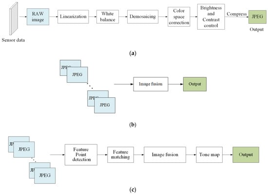 Modern digital cameras attempt to render a pleasant and accurate image of the world, similar to that perceived by the human eye [39]. As shown in Figure 1a, a typical camera IPP includes linearization, white balance, demosaicking, color correction, brightness, and contrast control, with the aim of converting raw sensor images to JPEG images. As shown in Figure 1b, the conventional direct fusion algorithm for multi-exposure sequences usually uses compressed JPEG formats, which are only suitable for inputs without camera shaking and object movement. Another traditional improved multi-exposure image fusion pipeline is shown in Figure 1c, which can be used to process the inputs with position offsets. However, the loss of key feature information in compressed images cannot be recovered by the fusion algorithms, and therefore the fusion results are usually undesirable.