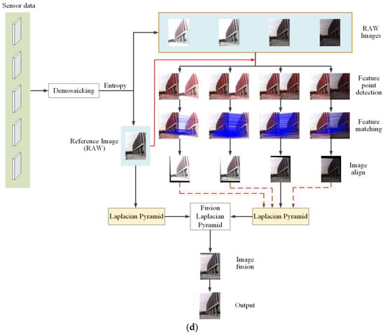 In this paper, an anti-shake HDR image acquisition method based on raw image sequences with camera shaking and object movement is proposed, which includes raw image processing, reference image selection, image registration, and image fusion, as shown in Figure 1d. Raw images are chosen instead of JPEG images for reference, as more feature points can be detected for matching. In the process of image matching, incorrect matches are rejected many times to achieve better matching accuracy and ensure the fused HDR images are of higher quality.