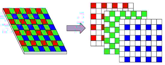 Instead of operating on sRGB images produced by the traditional camera processing pipeline, we operated using raw sensor data. Hence, we needed to convert raw images from a single channel to three channels based on Bayer interpolation algorithm to obtain full-color images, as shown in Figure 2.