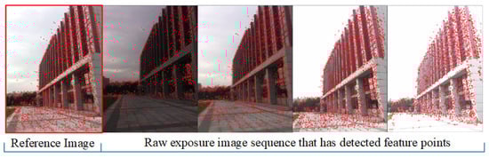 The proposed method utilizes the Oriented FAST and Rotated BRIEF (ORB) algorithm [41] to extract feature points of three channels raw images. The image marked with red box in Figure 3 is the selected reference image, and the rest of images are the raw image sequences to be matched. The red points in Figure 3 stand for the detected key points.