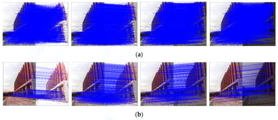 Although a large number of incorrect matches are eliminated in step one and step two, we cannot guarantee that the matches obtained will be perfectly exact. Hence, the last step is to reject the matches that do not obey the epipolar constraint by utilizing the RANSAC algorithm [42]. RANSAC is an uncertain algorithm that can estimate mathematical model parameters from the match set containing “outliers”, which are the matches that do not fit the model, and “inliers”, which are the matches that can be explained by model parameters. In this step, we assume all the matches retained in step one and step two are “inliers”, and then randomly select eight sets of matching pairs from the “inliers” to estimate the model by iteration, which can quickly compute the transform matrix. However, if one of the selected matches is an inaccurate match, the computed transform matrix will be incorrect. Hence, the Hamming and KNN algorithms are chosen to reject the most incorrect matches before RANSAC. Figure 4a is the matching result of raw image sequences without rejecting incorrect matches. Figure 4b is the final matching result by the RANSAC algorithm. All the incorrect matches were rejected, indicating that the proposed matching algorithm can greatly improve the matching rate.