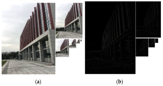 The Gaussian and Laplacian pyramid results of the raw image. (a) The result of the Gaussian pyramid; (b) The result of the Laplacian pyramid.