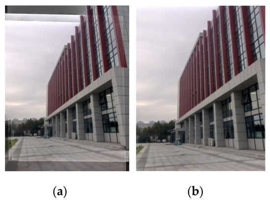 The alignment of raw images with camera shaking is a special challenge, so the homography matrix was adopted to warp the matched raw image sequences. This matrix was computed by the method of direct linear transform (DLT), as shown in Equation (4), which used to estimate the perspective transformation H matrix of the remaining matched feature pairs. For all feature points, the mapping error from the raw image to the reference image was calculated. The maximum inlier feature points set by the mapping error could be found, and the matrix H could be recalculated by the coordinates of the inlier feature points.