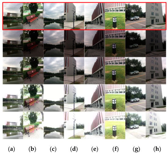 (a–h) are the sequences of a multi-exposure raw image. The top row is the selected reference image and the rest are the multi-exposure raw image sequences.
