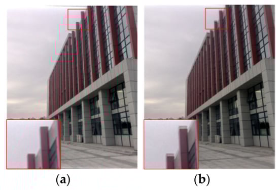 Figure 9a shows the fusion result of a raw image sequence with the proposed method, and the fusion result of the corresponding JPEG image sequence can be observed in Figure 9b. The experiments were performed on a computer with an Intel Core i7-4790 CPU, 3.6 GHz processor and 8.0 GB RAM. JPEG images lose much image information in IPP, which results in the poor quality of the final HDR images. There is distinct ghosting in Figure 9b (red box), but the ghosting does not exist in Figure 9a, which indicates that the proposed method is superior to the traditional method based on JPEG images.