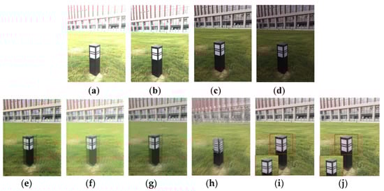 Multi-method fusion for multi-exposure images. In this section, the proposed algorithm is compared with other traditional methods on multi-exposure raw image sequences. In Figure 10a–d, a multi-exposure raw image sequence is shown, and the fusion results are shown in Figure 10e–j. In Figure 10e–g the fusion results of three tone mapping methods [25,26,28] are provided, and appear to have distinct ghosting. Figure 10h represents the traditional direct fusion result using JPEG image sequences as inputs, the performance is extremely poor. Figure 10i depicts the fusion result of JPEG image sequences with our method and a significant improvement in image quality can be observed, but ghosting artifacts can be seen in the red box. Figure 10j shows the raw image sequence fusion result, which achieves a satisfactory performance. In conclusion, the anti-shake performance of the proposed algorithm is superior to other traditional methods based on multi-exposure JPEG image sequences.