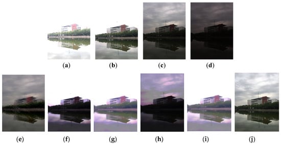 The sequence of exposure for the image and fusion results of the test. (a–d) The image sequence. (e) Fused image by JPEG directly. (f) Fused image using the method of Drago [28]. (g) Fused image using the method of Durand [27]. (h) Fused image using the method of Reinhard [25]. (i) Fused image using the method of Mantiuk [26]. (j) Fused image using our proposed method.