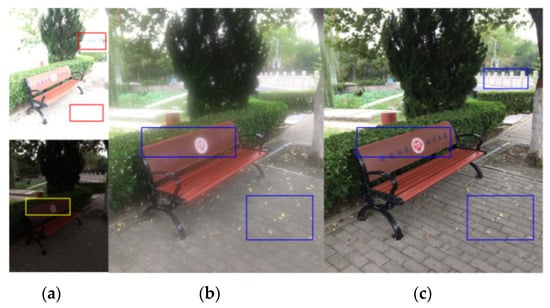 The red boxes in top of Figure 12a show the over-exposed regions which result in the loss of many image details, such as the outline of fence and the shape of bricks. Moreover, at the bottom of Figure 12a the lettering on the bench can barely be seen due to the lack of exposure in the yellow box. The blue boxes in Figure 12c show that the lost details generated by the proposed method have been recovered well. It can be seen that the fence, the blue writing on the bench, the rectangular bricks on the ground, and even the yellow leaves on the ground are demonstrated clearly. In contrast, the fusion results of compressed JPEG images are unsatisfactory; the words on the bench cannot be seen, and the shapes of the tiles are fuzzy (Figure 12b, blue boxes).
