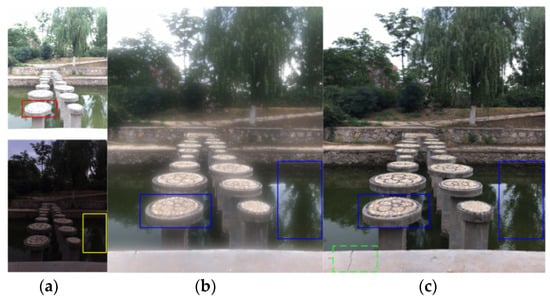 As shown in Figure 13a, the details of circular columns are lost due to over-exposure (region marked by red box), and there is no reflection in the water in the yellow box. The fusion results of JPEG images are shown in Figure 13b, where blurring of the stone in the circular columns can be seen. The blue boxes in Figure 13c show clear details and color fidelity, and the crack in the stone wall is also observed to be closer to the real-world scene. In summary, the experimental results show that our fusion method achieves an outstanding effect, even in extreme exposure conditions.