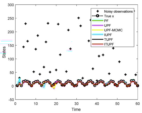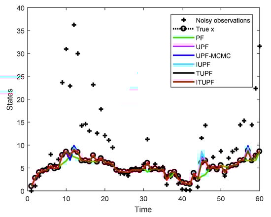 where the system noise had the same distribution as in the previous experiment. The measurement noise was also Gaussian with zero mean and variance 0.0001. The total time step and Monte Carlo runs were the same as in the previous experiment. We used 100 particles for all the filters in this experiment. The RMSE was calculated to compare the performance of different particle filters. The constraint was defined as: . Figure 4 shows the estimated and true states in a single Monte Carlo run with system data shown in Figure 5. The red curve denotes the state estimation results generated by the proposed ITUPF. Compared to the other estimation algorithms, ITUPF provided state estimates much closer to the true states.