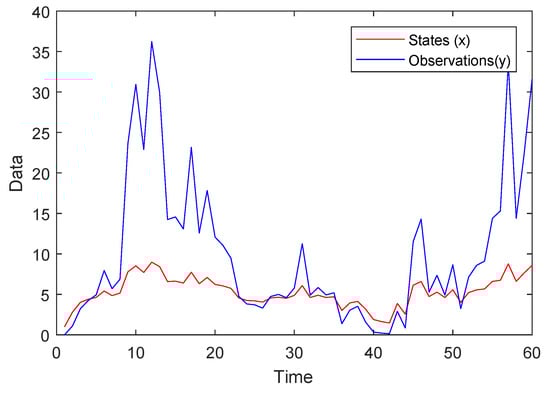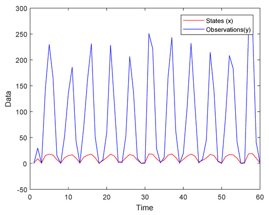 For the first simulation, we considered a univariate nonstationary growth model (UNGM) [15]. The nonlinear system and measurement models are as follows: