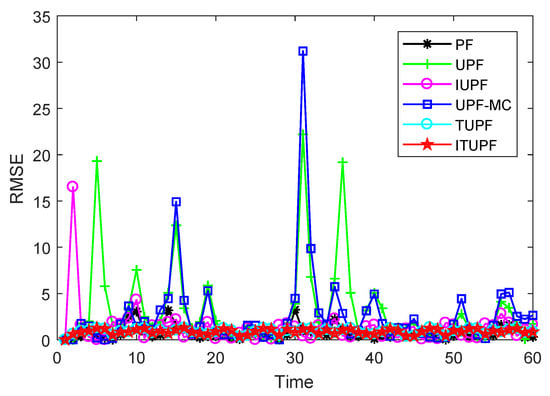 We also include the averaged RMSEs of each time step over the 100 Monte Carlo runs in Figure 6. The RMSEs of PF, UPF, IUPF and UPF-MCMC were obviously strongly fluctuating over time while TUPF and ITUPF were much more stable. The overall performance of our proposed method was better than the other filters.