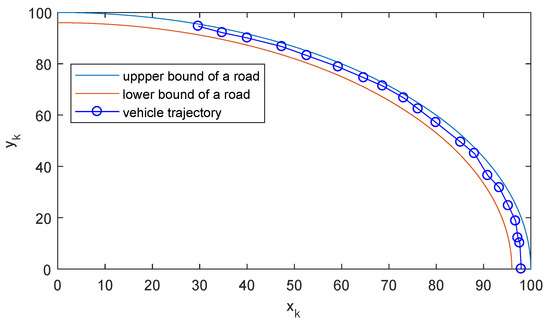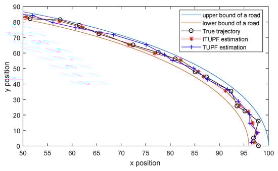 In order to further demonstrate the performance of the proposed ITUPF, we considered a problem of tracking a vehicle. The road was defined by two arcs with the radii and meters (m) while the center was at the origin of the Cartesian coordinate system. We supposed the vehicle kept angular velocity within degrees per second. In Figure 7, we show the outline of the the road and an example trajectory of the vehicle.