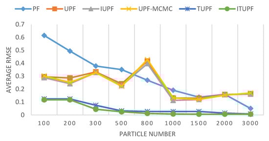 In this section, we discuss the influence of particle numbers on the estimation performance. Intuitively, the performance of a particle filter directly depends on the particle number. The more particles, the better the estimation accuracy. We used Model II in Section 4.2 with different particle numbers to do this experiment. Each particle number corresponds to 100 Monte Carlo runs. The average RMSEs are calculated and shown in Figure 9. The generic PF showed an evident RMSE decrease as the particle number grew from 100 to 3000, which demonstrates that its performance highly denpended on the particle number. UPF, IUPF, and UPF-MCMC also showed a similar trend to the generic PF. However, such a trend was less evident than in the generic PF. When it comes to TUPF and proposed ITUPF, we can see from this figure that the RMSEs of the two methods decreased evidently when the particle number grew from 100 to 500. However, this downward trend became less apparent as the particle number continued to rise. The RMSEs of ITUPF was consistently lower than the other filters.