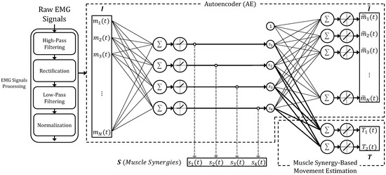 - Model: , where m is the muscle activation signal vector processed as the input data of the AE (see Figure 2) [13];