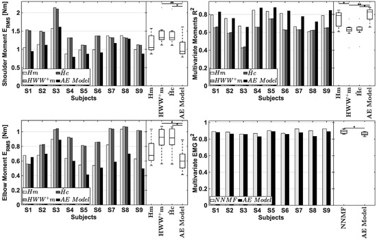 Considering the success that synergy-based myo-controllers are achieving in the wearable robotic field, the authors have investigated whether the synergy activations extracted with the AE could be used in motion intention detection. In detail, the proposed AE-based estimator has been compared with three other methods already proposed in the literature for their capabilities of estimating shoulder and elbow joint moments generated while performing planar isometric reaching tasks. The comparison has been conducted analysing the and between the estimated and measured moment of both the shoulder and the elbow articulations. The clear messages that arise from the statistical analysis and the Figure 3 are: (1) the proposed method outperforms the two synergy-based approaches and and such difference is statistically significant; (2) no statistical difference has been found between the proposed method and the model that considers a direct mapping between the EMG signals and the joint moments. Such findings seem promising since the proposed method is able to achieve the comparable performance of the model even if introduces some loss in the EMG signal information due to the AE bottleneck.