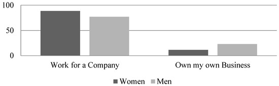 Over half (53.5%) of the women surveyed were married, while over two-thirds of the men (69.6%) were married. In total, 46.5% of the women and 57.9% of the men had children. Although closely divided, the majority of the respondents were in their late 30s to early 40s and married with children. As revealed in Figure 1, 11.4% of the responding women owned their own business, while over one-fifth (22.2%) of the responding men were business owners—almost double the rate of women. As expected, the vast majority of both women and men worked for someone else.