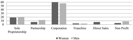 Figure 2 gives more specific information regarding the organizations in which the respondents work. As noted, over half of the respondents work for corporations. Within this group, more than 60% of both women and men work in either service or manufacturing.