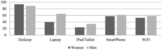 Respondents were asked to indicate devices or technologies that they used. Figure 3 lists the options and percentage of respondents having access by gender. Many reported access to multiple technologies, with the most used device being desktop computers. Significant differences were noticed for the use of laptop computers. Only 39.4% of the female respondents had access to laptops, while 64.8%of the men indicated usage of laptop computers. Differences relating to gender for other technologies were minimal.