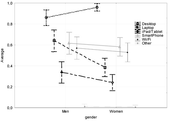 Figure 4 presents the interaction between the access to technology and gender. When respondents indicated “yes” in response to using a particular device or technology, it was coded as 1; otherwise, a code of 0 was used. The interactions reveal that both men and women have a high level of access to computers and technology.