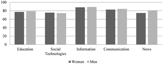 All respondents indicated that they are aware of the benefits technology can provide. When looking at the different areas, as shown in Figure 6, at least two-thirds of women and men found benefits in all areas, with information and communication averaging slightly higher than the others. Social technologies—the main focus of this study—received a “vote of confidence” by 75.6% of the women and 74.4% of the mean.
