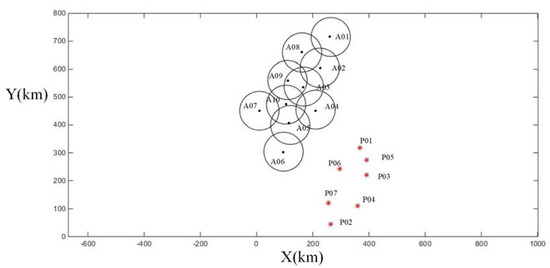 The FY-1 UAV could be equipped with two sensors, S-1 and S-2. The S-1 sensor was an imaging sensor that used a wide-area search mode to imaging targets. The S-2 sensor was an optical sensor. In order to achieve a certain accuracy of target recognition, the distance between the sensor and the target should not exceed 7.5 km when the ground target is photographed, which can instantly complete the photographic task. Due to the limitations of various technical conditions, this series of UAVs could only be equipped with one of the S-1 and S-2 sensors at a time. Each target should be detected at least once by both UAVs. One UAV was equipped with an S-1 sensor and the other was equipped with an S-2 sensor. In order to ensure effective communication between the UAV and the ground control center, a special FY-2 UAV should be arranged to perform the communication task. The communication distance between the UAV for communication and the UAV for reconnaissance was limited to 50 km. Figure 1 shows the distribution map for the bases of the enemy and our side.