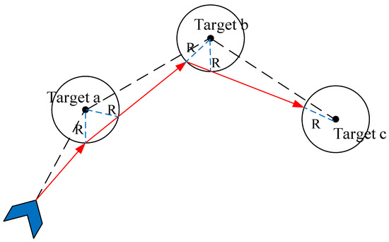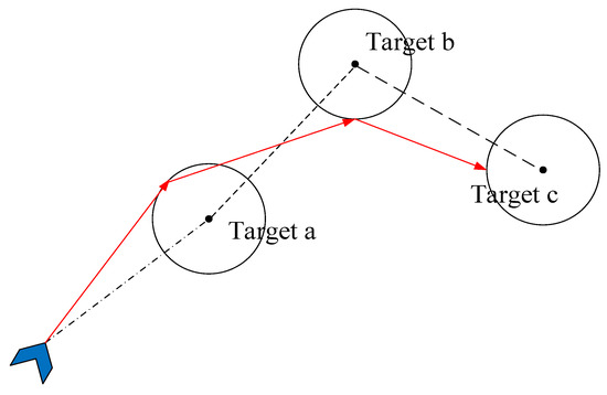 The black dotted line in Figure 4 is the shortest route in the target group obtained by the decision of the second layer, and the red line is the UAV track arranged according to the characteristics of the sensor. When the UAV takes off from the base and flies to the target, it directly reaches the intersection with the circle where the target a is located. After the target a is detected, it flies to the target b and directly reaches the intersection of the circle where the target b is located, and finally returns to the base. The first and second line segment in the red path is the UAV’s mileage to target a and target b, respectively, according to the shortest line in the decision of the second level, and the line segment c is the UAV’s mileage to target b after detecting target a. Since the takeoff route from the base is certain, according to the principle that the sum of the length of the two sides of the triangle is longer than the length of the third side, the red route is inevitably superior to the black route. Due to the characteristics of the S-2 sensor, in a route, if the next target point contains the current starting point, the UAV can directly detect the next target point, and the UAV skips the next target point and flies to the target point afterward.