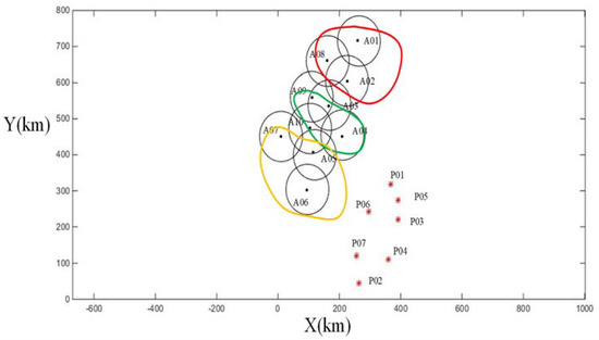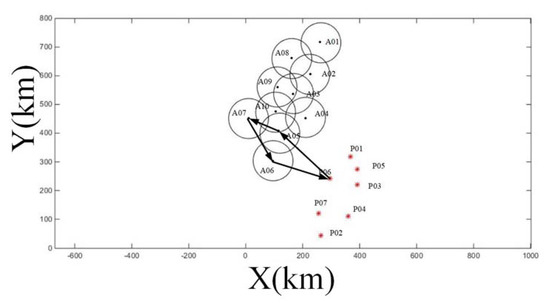 Equation (7) indicates whether the UAV a is flying from base p to target i. If , UAV flies from base p to target i. The time loss of UAV which flies from the base to the starting point or ending point of the target group is denoted by Equation (8). is the number of UAVs in base p. Equation (9) shows that the number of UAVs on the mission at each base does not exceed the number of UAVs owned by the base. is the maximum endurance of the UAV. Equation (10) indicates that the flight time of each UAV cannot exceed its longest flight time. The shortest flight time outside the radar detection range is . Equation (11) denotes the total flight time of the UAV.