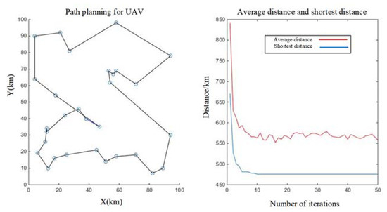 When the number of ant colonies was 30, the best shortest path could be obtained, but the average distance was relatively large when the number of ants was 30. Considering that the shortest path is more important in UAV path planning, the final parameters were as follows: number of populations = 30; number of iterations = 60. Then, we transferred the fuzzy ant colony algorithm with this configuration to a more complex task. In this task, there were 500 targets on the map.