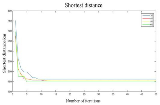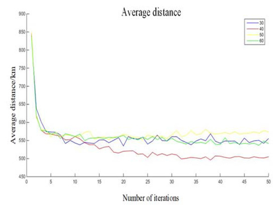 Because the hyper-parameters are critical for the ant colony algorithm, we must firstly choose the best parameter configuration. In the Matlab simulator, this paper conducted an experiment to adjust the parameters of the fuzzy ant colony algorithm in solving the specific problem, taking the TSP problem as an example. The number of an ant colony is an important factor that affects the convergence rate and performance of the ant colony algorithm. The shortest distance and average distance were compared when the number of ants was 30, 40, 50, and 60. The number of iterations was set to 50 times, and the number of targets was 50. For each parameter configuration, we randomly generated the targets to test this algorithm parameter using a considerable number of tests. In each test, four parameter configurations were compared. For one test, the experimental results are shown in Figure 6 when the number of ant colonies was 30. The comparison of the shortest path and the average path of a different number of ant colonies is shown in Figure 7 and Figure 8.