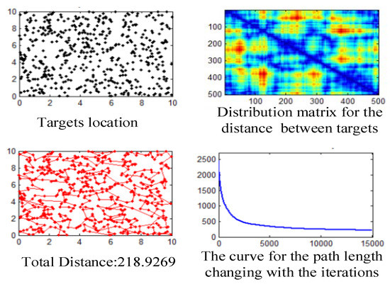 In Figure 9, the experimental results show that the number of iterations was 14,979, and the total distance was 218.9269 if there were 500 targets. Using the fuzzy ant colony algorithm with this configuration, the total length of the path would eventually converge in a more complex task. The distribution matrix represents the result of path planning, which shows the distance between different targets. In the distribution matrix, different colors represent different distances between targets. Blue means closer, while red means farther. In this paper, the parameters were used in the fuzzy ant colony algorithm for path planning of the UAV, and the global path planning of the three target groups was obtained as shown in Figure 10. In Figure 10, flight paths for the three target groups of UAVs were computed using the fuzzy ant colony algorithm.