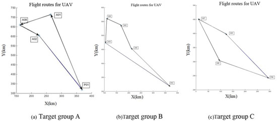In this paper, a clustering method was used to get three different target groups: A, B, and C. After clustering, the base of UAV flying to each target group was obtained using the nearest principle. The target group A was sent to UAV by base P01 for reconnaissance. The target group B was sent to UAV by base P01 for reconnaissance. The target C was sent to UAV by base P06 for reconnaissance. UAVs with S-1 sensors and UAVs with S-2 sensors were needed to detect each target according to conditions. In order to minimize the flight path of UAV, the flight path of UAV with the S-1 sensor was the same as that of UAV with the S-2 sensor.
