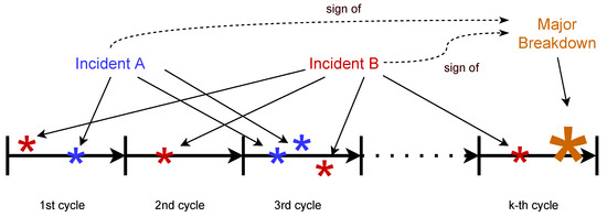 One of the significant challenges in IoT is scalability. Due to the nature of the distributed and scalable network, IoT objects inter-communicate more frequently, and a large amount of message transmission happens. Most large-scale IoT systems operate based on the feedback-control loop model [4,5,6]. In this feedback-control loop model, once a breakdown occurs, it will cause a chain of breakdown to the cyber and physical parts and eventually will risk the safety of the user [7]. Therefore, before an accident happens, it is important to analyze and detect minor incidents as early as possible. From the viewpoint of incident management, it is important to detect minor abnormality so that proper preventive measures can be taken accordingly. However, incidents caused by minor abnormalities do not always occur in every cycle. Figure 1 illustrates incidents caused by minor abnormalities that occur at certain system cycles. IoT systems are prone to minor abnormalities that may be caused by broken sensors [8], low-battery power [9], and weak signals due to interference [10]. These factors do not directly cause abnormal behavior but show the signs of a major breakdown in the future.