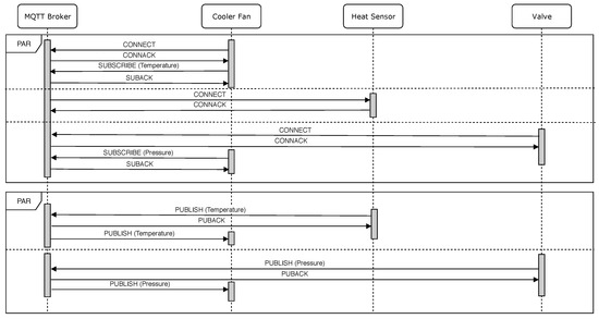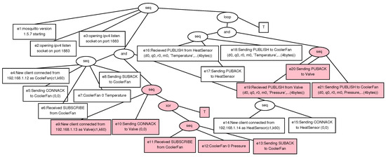 It is crucial to implement a system that monitor NCS, ICS, SCADA, or DCS to ensure continuous normal operation. However, monitoring a system is still a challenging task due to the infrequent occurrences of abnormality at each system cycle. In order to verify the stability and correctness of the IoT systems, a constant monitoring and verification technique is required. The most practical way of monitoring complex and scalable closed-loop IoT systems is by modeling its normal behavior and look for any deviations during operation. However, for systems with high parallel message transmission, they will have minor and infrequent random changes in the system behavior. Therefore, it is hard to detect any deviations by only looking at one point of an event such as packet header or data value. The IoT Developer Survey 2019 by Eclipse Foundation [11] showed that IoT protocol such as MQTT [12], XMPP [13], REST [14], and CoAP [15] is gaining attention from system developers. These protocols can ensure the quality of services and stable message handling. Figure 2 shows an example of the message passing of a heating, ventilation, and air conditioning (HVAC) system via MQTT protocol. The HVAC system consists of a message passing server called broker, heat sensors, valves, and cooler fans. It shows a simple message passing between the broker and the nodes with CONNECT, CONNACK, PUBLISH, PUBACK, SUBSCRIBE, and SUBACK messages executed in sequence within two parallel (PAR) blocks. The execution sequence between PAR blocks has no sequence order. However, the sequence order of MQTT’s handshaking inside the PAR blocks must be strictly followed at all times. Due to factors such as low battery power or signal interference, messages might be dropped or delayed. It is hard to detect dropped or delayed messages by only looking at one point of message passing event.