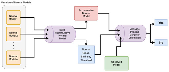 In this paper, we propose a process-based message passing verification method for IoT systems. While conventional detection methods focus on monitoring data packets at one point, we focus on the accumulative events of message passing. Concretely, we verify the relationship of the execution order of message passing between the devices over a certain period of system cycle. As shown in Figure 3, we performed a ‘bird’s eye’ monitoring technique by discovering the variation of the process model of the message passing behavior with process mining. Then, we grasp the structure of the process model with a tree model called process tree to produce an accumulative normal model. Using the process tree, we check for any deviations from the normal behavior by comparing the observed behavior with the accumulative normal model.