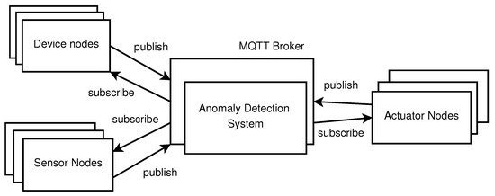 Figure 4 shows an example of an anomaly detection system positioned in an IoT system. The message passing log is collected from the centralized log collection server, such as the broker. Our objective is to detect if there is any deviation of message passing behavior from normal behavior. If the HVAC system is a closed-loop system that only operates at pre-specified execution order at all times, we should expect the same behavior for normal operation. Several works have been proposed in Ref. [16,17,18,19,20,21,22] regarding behavior verification. However, as stated in the previous sections, we cannot ignore fluctuations [23] and delays in a system. Most IoT systems such as WSN run in low-power and lossy networks where delayed messages and dropped messages are expected.