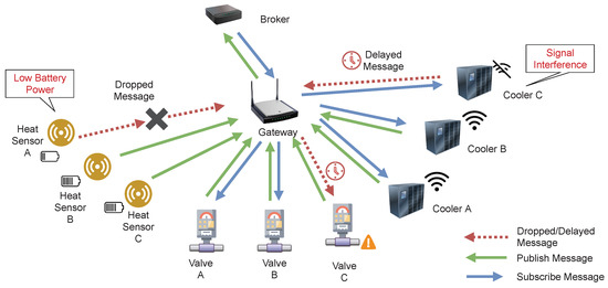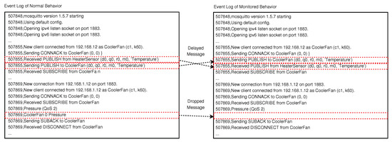 Figure 5 shows the illustration of a publish-subscribe message of the HVAC system in a building automation system. The message passing protocol was described in Section 1. The HVAC system operates to control the temperature by controlling the level of heat by circulating steam and air using a valve and cooler fan. Steam is circulated through the valve, depending on the level of heat sensed by the heat sensor to various rooms in the building. Then, the cooler fan controls the air ventilation to minimize the temperature difference between outdoor and indoor air temperature. The sequence of message passing is important for temperature control. A heat sensor must be able to continuously send messages containing the heat status i.e., at each 1 s interval. Then, the valve and cooler fan must receive the data at every 1 s simultaneously so that the difference between the temperature is controlled properly. In case of low battery, a heat sensor might infrequently lose power and drop the message at around 2 or 3 s intervals. Fluctuation in sensor reading can cause unstable circulation of steam and air inside the rooms. Furthermore, if signal interference occurs due to a large area or dense sensor network, the cooling fan might not be able to send or receive the signal for a while. Communication protocols such as MQTT can guarantee the quality of service by repeating to send the same message again. However, even though the message is delivered, the message is considered a late message because of the delay. Delay in sending messages can cause an asynchronous response between the cooler fan and the valve. Therefore, the cooler fan and valve will have to work harder than usual to circulate the steam and ventilate the air. Eventually, it will cause a breakdown of the steam and air circulation system. See Figure 6 for an example of a dropped message and a delayed message in an event log. In conventional ways, the event log is only used when looking at a point of events. However, when the above fluctuations and delays occur, it is hard to grasp any unusual behavior by only looking at the event log. Some messages might be missing or recorded in disoriented order.