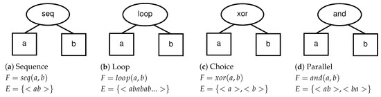 Process tree [24,25] represents the structure of a process. Each leaf node and each internal node respectively represent tasks and operators in the process. Process trees can be obtained from the event log using a process mining algorithm called inductive miner (IM) [26]. IM is available in the process mining tool ProM [27] as a plugin. Figure 7 shows the most basic process trees and its formula F. It has four operators ; sequence (), selection (), parallel (), and loop () operators. An ordered operator has child nodes with an ordered relationship, such as and . An unordered operator has child nodes with no ordered relationship between them, such as and . The process tree is represented by . The definition of a process tree is given as follows: