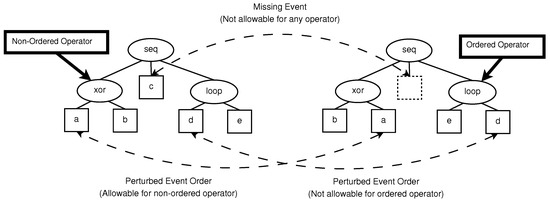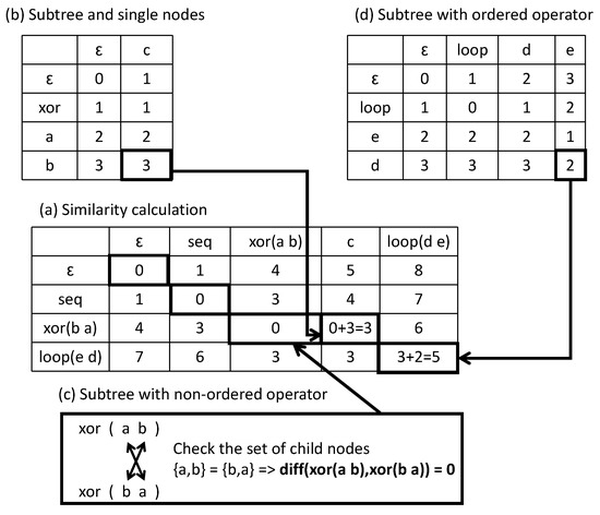 Figure 9 shows the cases that determine the editing costs of process tree; (i) process trees with both ordered operator; (ii) process trees with both non-ordered operator; and (iii) process trees with different operators. Here, we apply the concept of equivalence to show that a process tree is the same at . Basically, the process tree is equivalent to if the root operator and the subtrees are the same. Then, if the root is an ordered operator, i.e., sequence or loop, then its subtrees must be equivalent in order from left to right. If the root is a non-ordered operator, i.e., parallel or exclusive-choice, then the sets of the subtrees must be the same. The order of subtrees is ignored for non-ordered operators. Next, we check the equivalence of subtrees recursively and return the equivalence value of each subtree. For ordered operators, we check the subtrees in order, and for an unordered operator, we perform an element subset cross-check between all of the subtrees.