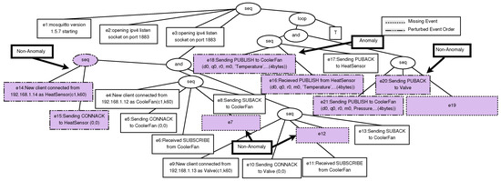 - Perturbed Event Order: Event order are not in normal order i.e., change of to . This anomaly might be caused by delay in MQTT message passing or invalid control-flow execution.