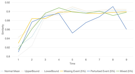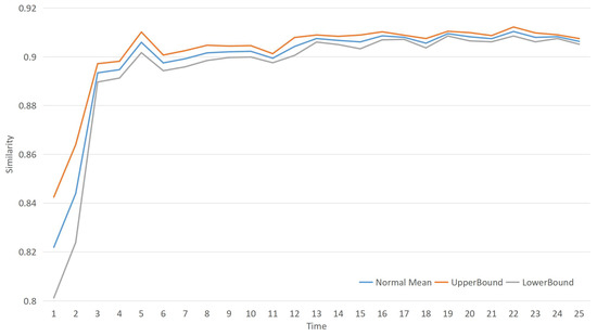 Mean of similarity of all normal process trees with lower bound and upper bound at a 95% confidence interval.