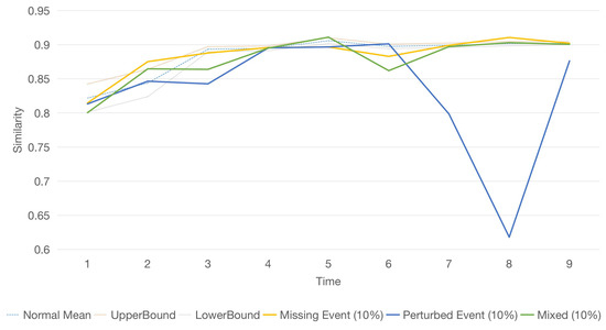 The standard deviation using the lower bound and upper bound of the cross-similarity between 1 min and 100 min is shown in Figure 13. The standard deviation of less than 0.01 after 3 min shows that the models became more stable over time. However, no perfect similarity is achieved between the models. It shows that every time there are minor parts that cause the process tree to be different due to a large number of parallel events. After 3 min, the amount of noise only changed between 27% and 28%. Therefore, by considering the similarity that is less than 73% to 74%, we can detect the anomaly.