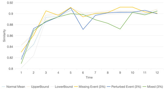 Figure 14 shows the detection result of anomaly with occurrence probability at 10%. We can see major deviations from the threshold value at first detection (3 min). All anomalies deviate from normal behavior. Even at 10%, anomaly probability has a strong influence on system behavior. Therefore, if an anomaly occurs more than 10%, we can easily detect the changes in behavior. Figure 15 shows the detection result of the anomaly with occurrence probability at 5%. We can see minor deviations from the normalized threshold value at first detection (3 min). The perturbed event order shows an obvious deviation. A mixed anomaly is mostly near the lower bound and was detected after 8 min. Figure 16 shows the detection result of the anomaly with occurrence probability at 3%. We can see minor deviations from normal threshold value at first detection (3 min) of system operation (for perturbed event and mixed anomaly). The first detection of a missing event is slower (15 min) compared to other anomalies. Overall, we successfully detected the three types of anomalies at a different time interval.