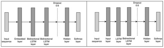 In a bidirectional LSTM, two independent RNNs are merged, allowing the network to receive both forward and backward information at every time step. This may result in a higher accuracy compared to when a single LSTM is used. The Dropout layer prevents overfitting on the training data. This is followed by a Hidden layer and the final predictions are made using a Softmax activation function.