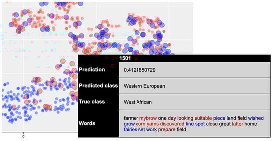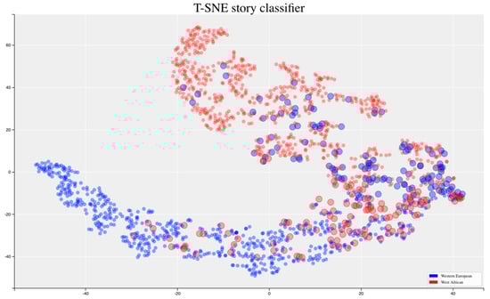 Creating the t-SNE visualization proved the ideal approach to demonstrate and confirm this distinction. Sentences of the folk tales were represented in a high-dimensional fashion in the hidden layer of the LSTM. The t-SNE showed that words that we would associate with West Africa or Western Europe had a high likelihood to be placed in their expected class. Misclassifications occurred with sequences containing words that occur similarly often in both corpora. It could be argued that, given more data, an LSTM which takes into account interdependency between words could have correctly classified these sentences. The results confirm the observations described in Section 4.4, in which participants of the survey made similar choices based on use of characters, animals, and objects.