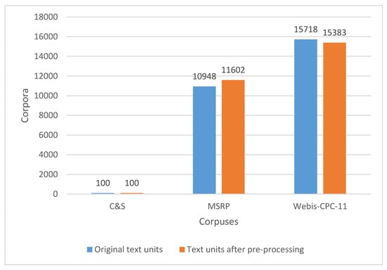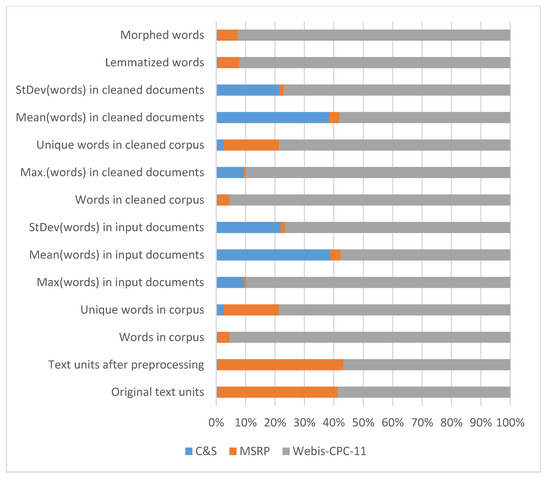 Table 1 and Figure 2 present some descriptive statistics about corpora used in the experiment. The C&S corpus consists of 100 text files. Five of them are original texts that had to be paraphrased by instructed students in four different ways and levels. The MSRP corpus is in the shape of three files: train, test, and data. The train and test files consist of records containing five tab-separated fields: quality, #1ID, #2ID, #1String, and #2String. The data file contains records of seven tab-separated fields: sentence ID, string, author, URL, agency, date, and web date. In our experiments we used the train and test files, because they include official information whether a pair of sentences is paraphrased or not. We have split 5801 pairs of sentences into 11,602 individual documents, but some of them were used more than once, so we got 10,948 unique documents. The Webis corpus consists of 23,577 text files (3 × 7859) but we extracted and removed 1/3 (metadata file) from the table metadata as (1) the metadata can be used in more practical form and (2) the models would be negatively affected with the metadata files. Thus, every one of the 7859 paraphrase pairs is represented by three files, containing the original text, the paraphrased text, and a metadata with information about the task identifier, task author identifier, time taken, and whether the paraphrase was accepted or rejected [61]. The Webis corpus contains 335 blank files. All of these files have paraphrases in the name and the official annotation 0 indicating that the document pair is not a paraphrase.